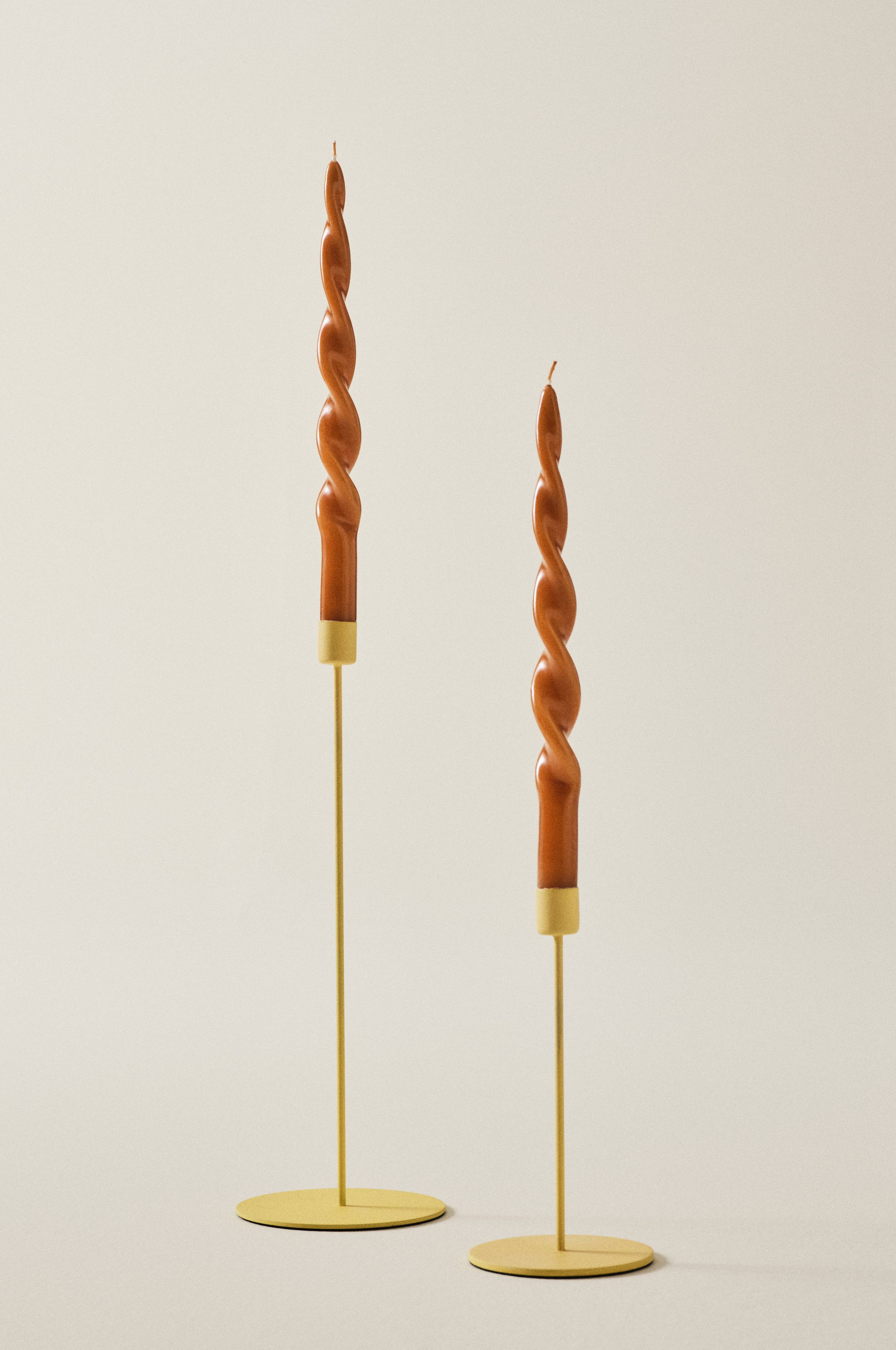 2-pack levande ljus av stearin och paraffin som sedan doppats i färg och lackats. Ljusen är vackert skruvade och de har vridits för hand för att skapa formen. Ljusen är mycket dekorativa även när de inte brinner. Levande ljus skapar en extra mysig känsla. Stearinet innehåller inte palmolja.