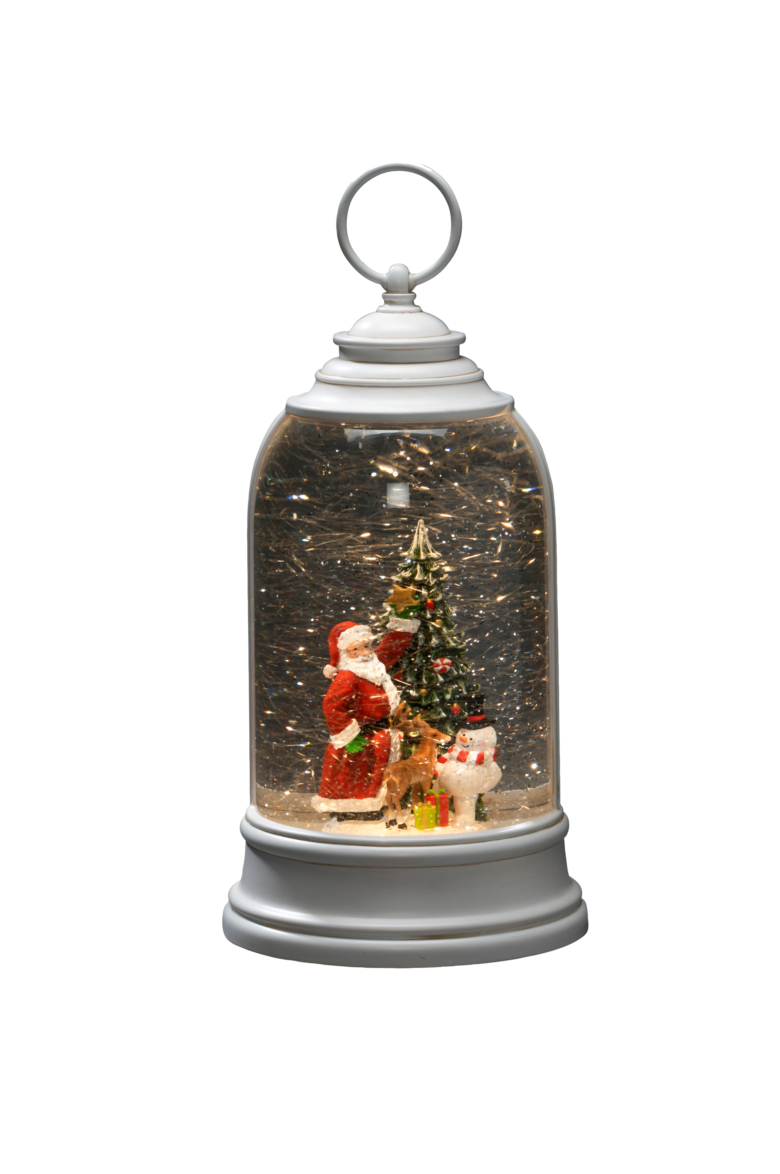 Vattenfylld juldekoration med en tomte och en snögubbe . Kontinuerligt virvlande glitter. Varmvit led. Drivs antingen med 3st c batterier (ingår ej) eller usb. Lyktan har en timerfunktion på 5 timmar. 1,8 meter usb kabel medföljer. Höjd 36,5 cm, bredd 17,8 cm djup 17,8 cm.