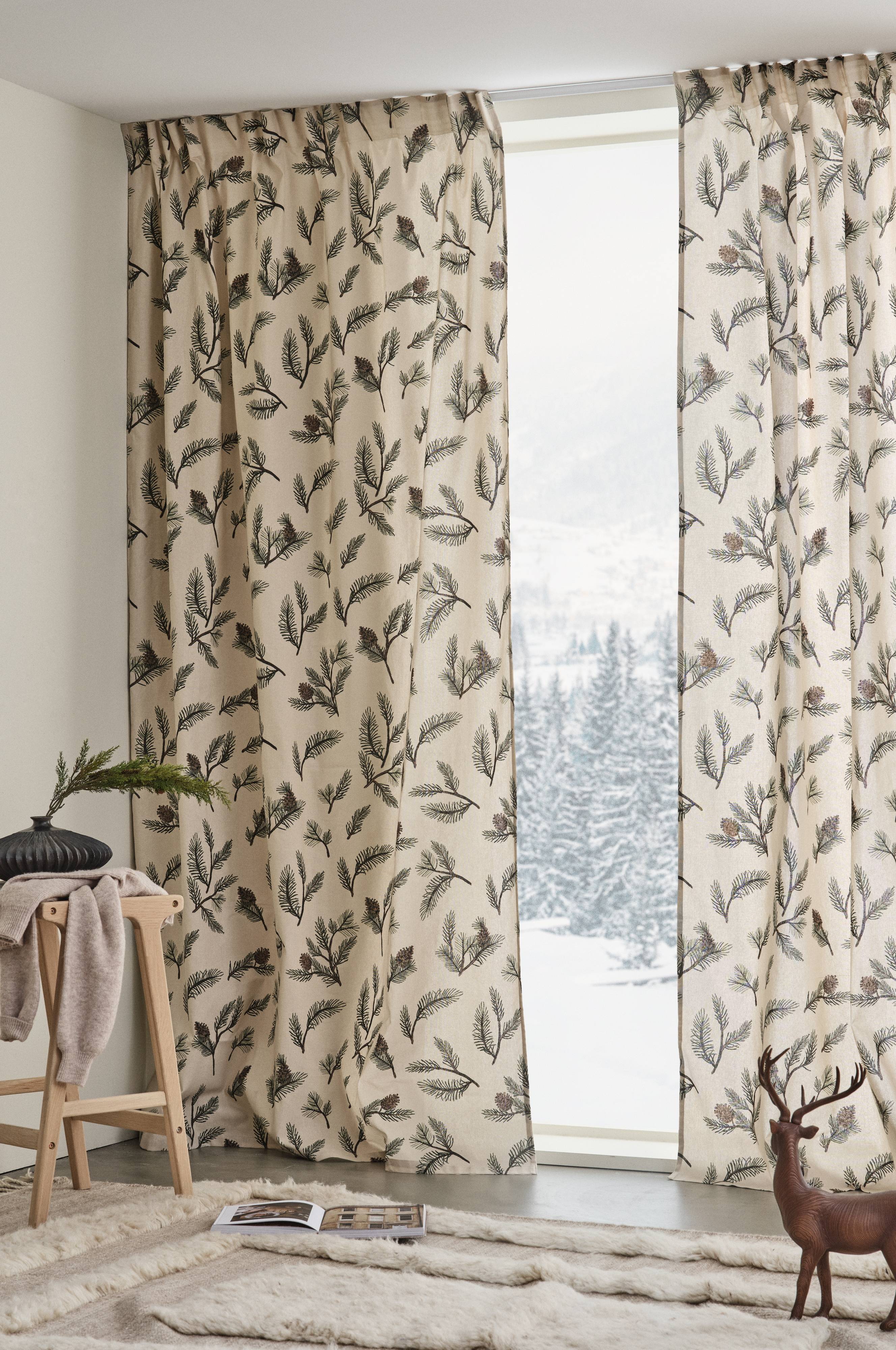 Två gardinlängder i kraftig och samtidigt lite glesare vävd bomull. Kottar och barr ger mönstret VEJA sin härligt naturliga känsla, mönstertrycket har inspirerats av våra vackra skogar och skapar härlig stämning till jul, men gör sig lika fint hela året. Påsytt multifunktionsband upptill gör att gardinen kan hängas upp med fingerkrokar, kanal samt dold hälla.