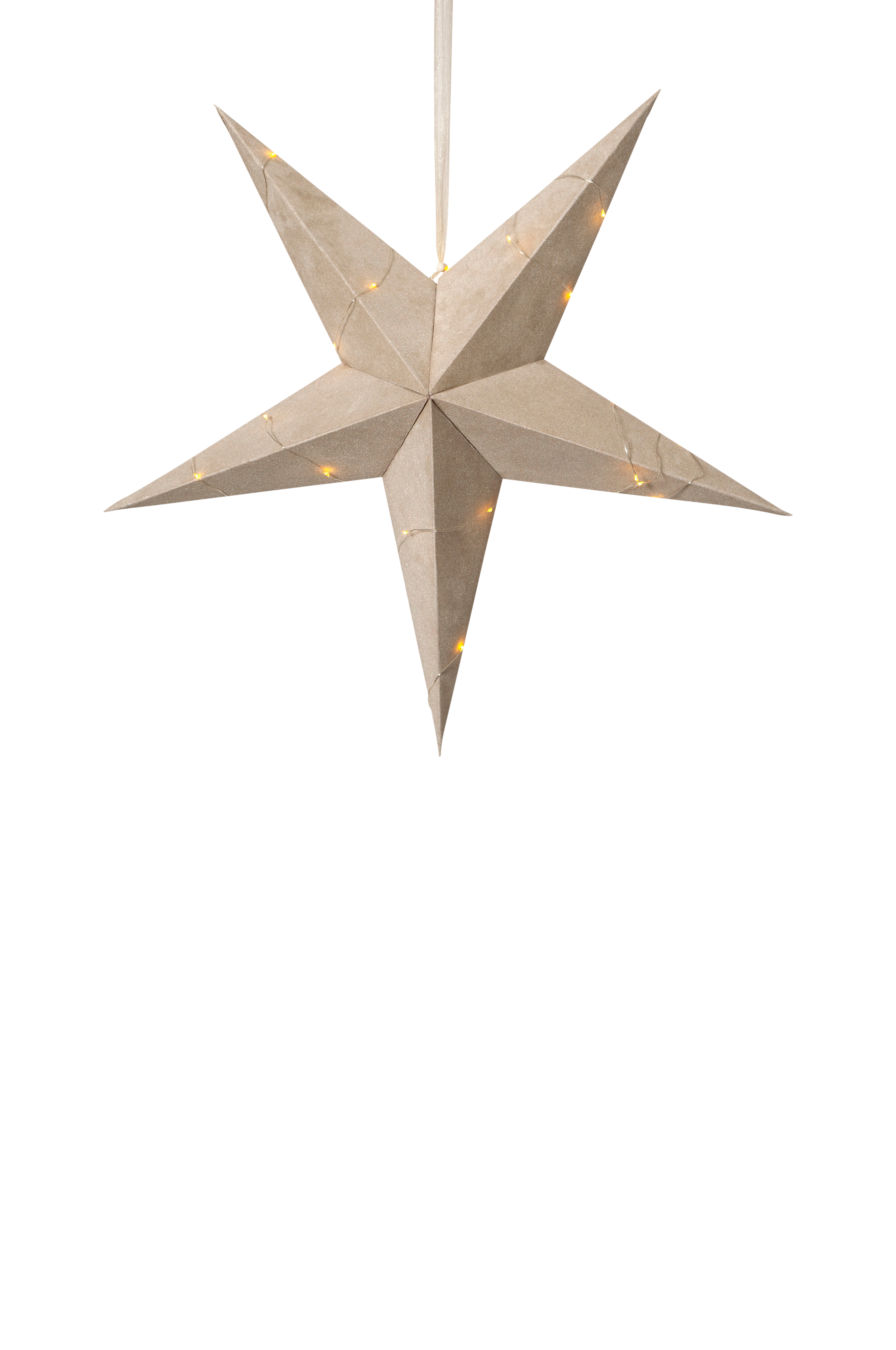 Sammets stjärna med dew drops slinga BO med 40 LED för innomhus bruk, kan användas både hängande och stående mot en vägg. En mysig inredningsdetalj till hemmet. Höjd 60 cm. Drivs med 3 AA batterier (ingår ej). Timer 6 h på, 18 h av, repeterande.