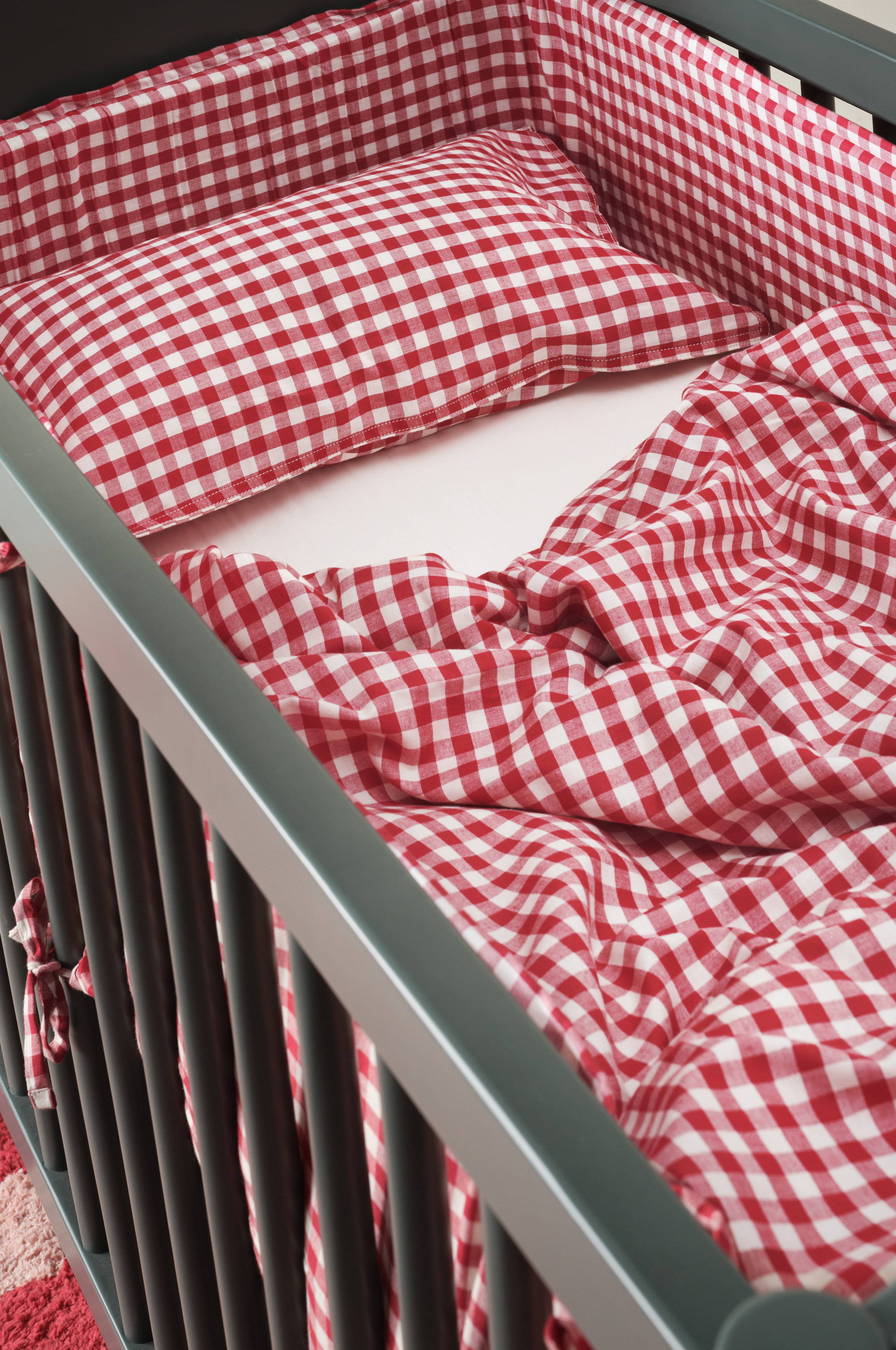 Rutvävt påslakanset med ett påslakan och ett örngott i härlig, ekologisk bomullskvalité. Setet passar bra till spjälsängen. Tyget är tvättat för att få en mjukare känsla och bomull känns svalt och skönt mot huden. De garnfärgade rutorna går i klassiska färger, lätta att matcha med annat. Trådtäthet på 118 tc. (Trådtätheten talar om antalet trådar, thread counts, per kvadrattum i ett tyg. Ju högre trådtäthet desto högre kvalité.)