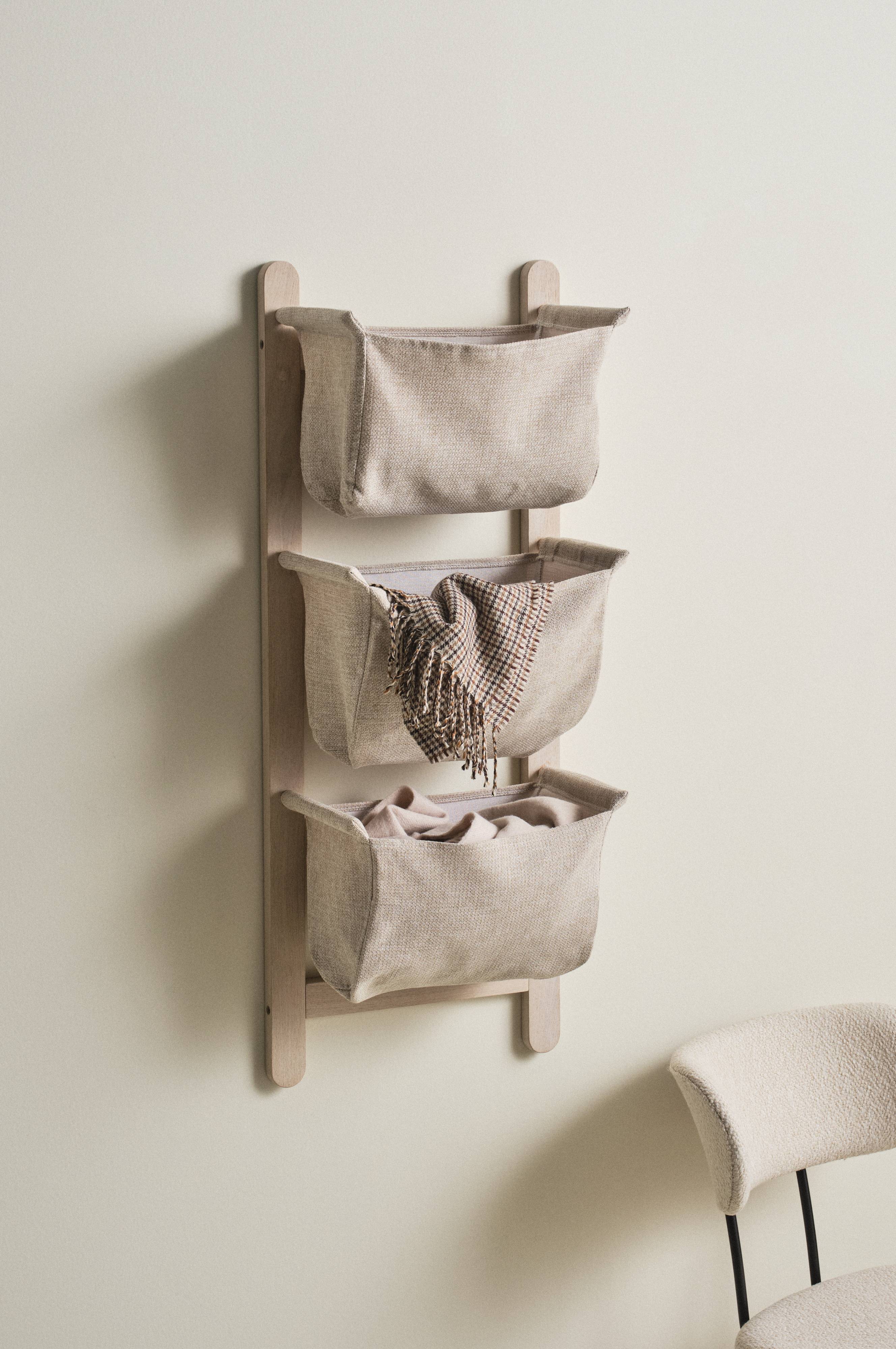 Vägghängd förvaring i stilren design med influenser från naturen och den nordiska stilen. Stommen är av FSC-märkt, massiv ek. Träet har fått en mjuk, såpad yta. Tyget i de tre påsarna är i linnefärgad canvas av polyester/polyamid. Påsarna kan tas av och tvättas. VIK passar lika bra till vantar i farstun som till leksaker i barnkammaren eller udda sockor och klädnypor i tvättstugan. Viss montering krävs. Monteringsanvisning medföljer.