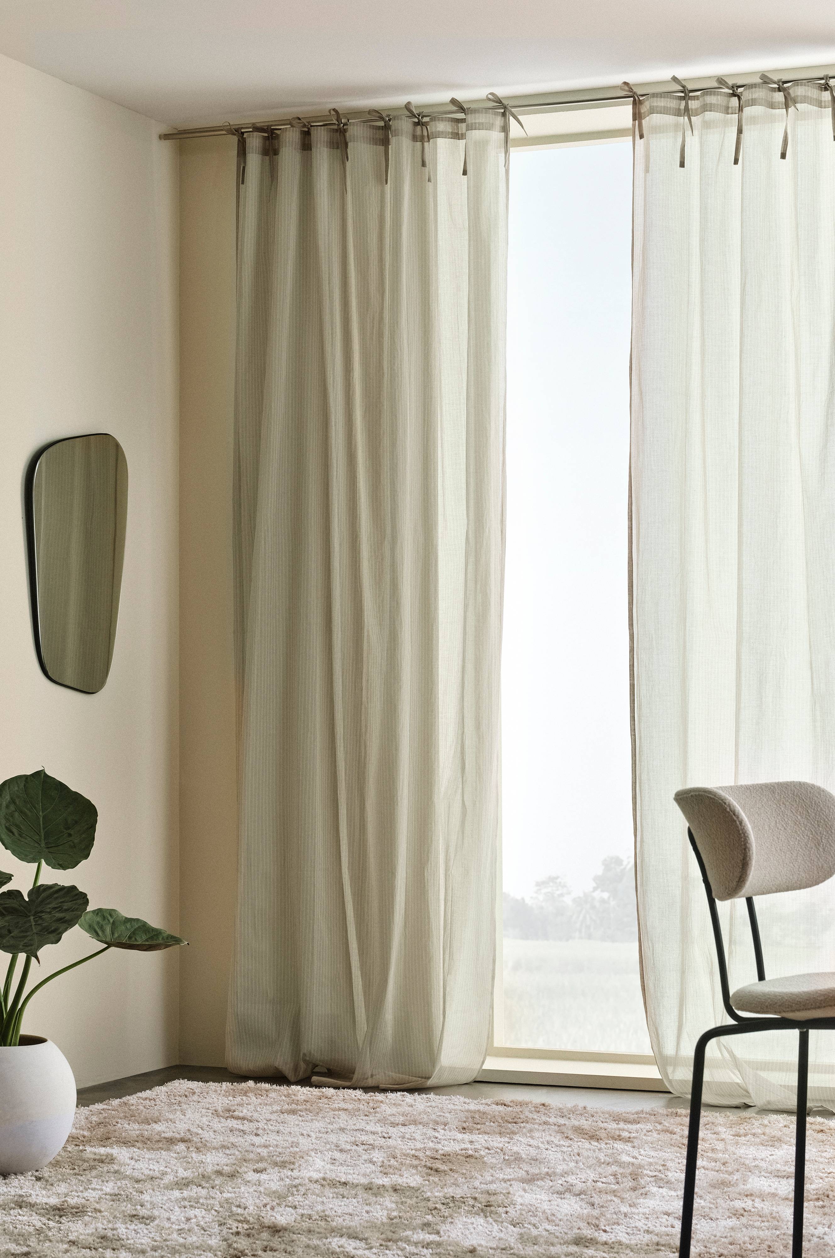 Två knytbandslängder av skir och krispig voile. Det fina, smalrandiga mönstertrycket är lätt transparent och silar in ljuset genom dina fönster. Varje längd har 8 par knytband som du knyter runt en fin gardinstång. Overlocksöm nertill.
