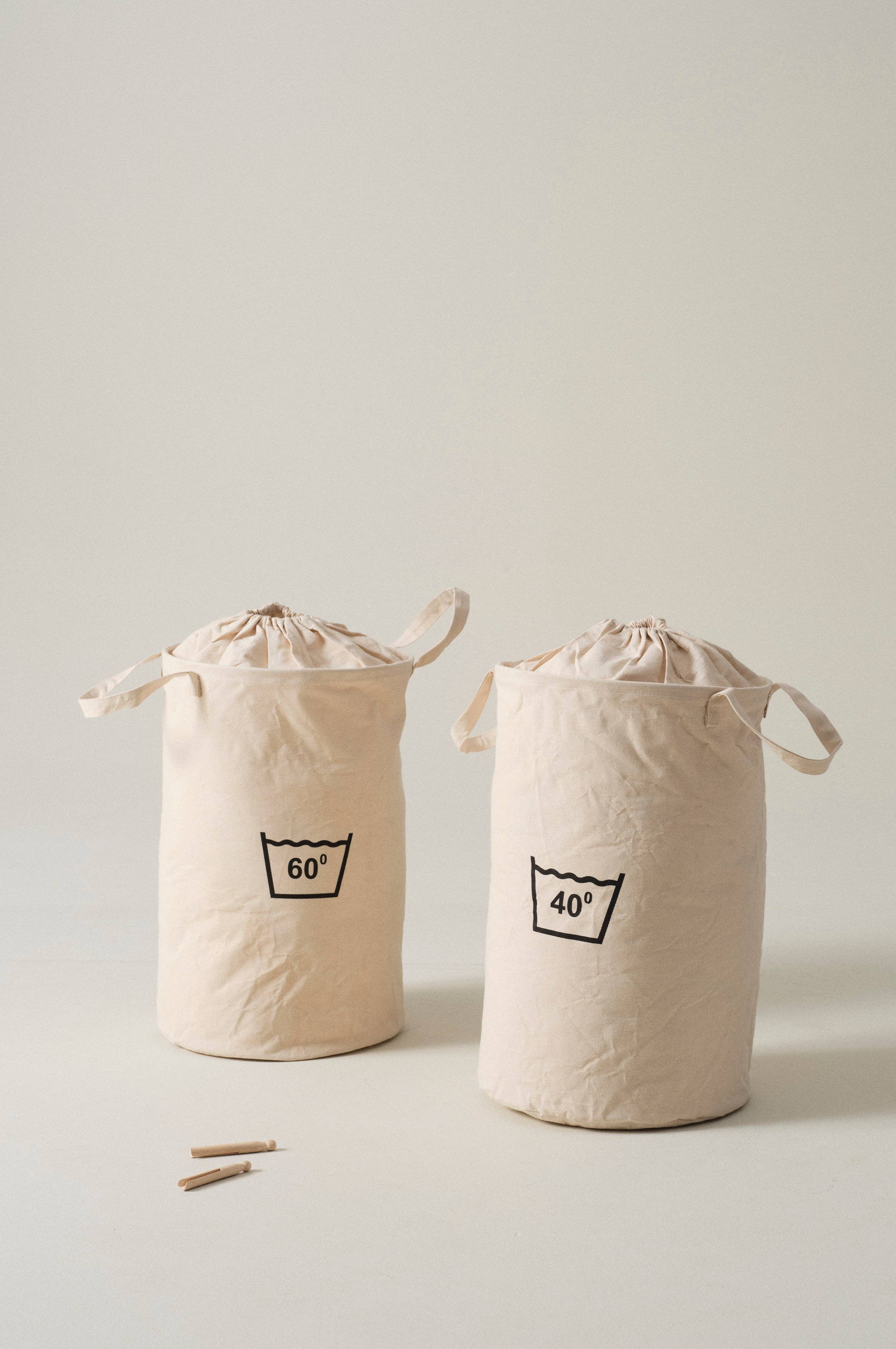 2-pack tvättkorgar i vävt tyg av bomull, båda har tålig insida, laminerad med polypropylen. De båda tvättkorgarna har olika tryck, 40° respektive 60° så att du praktiskt och enkelt kan sortera tvätten direkt. När du ska tvätta är sorteringsarbetet klart och du väljer vilken tvätt som står på tur. Tvättkorgarna är runda och har två praktiska handtag så du kan bära dem till tvättstugan, även om det är en bit att gå.
