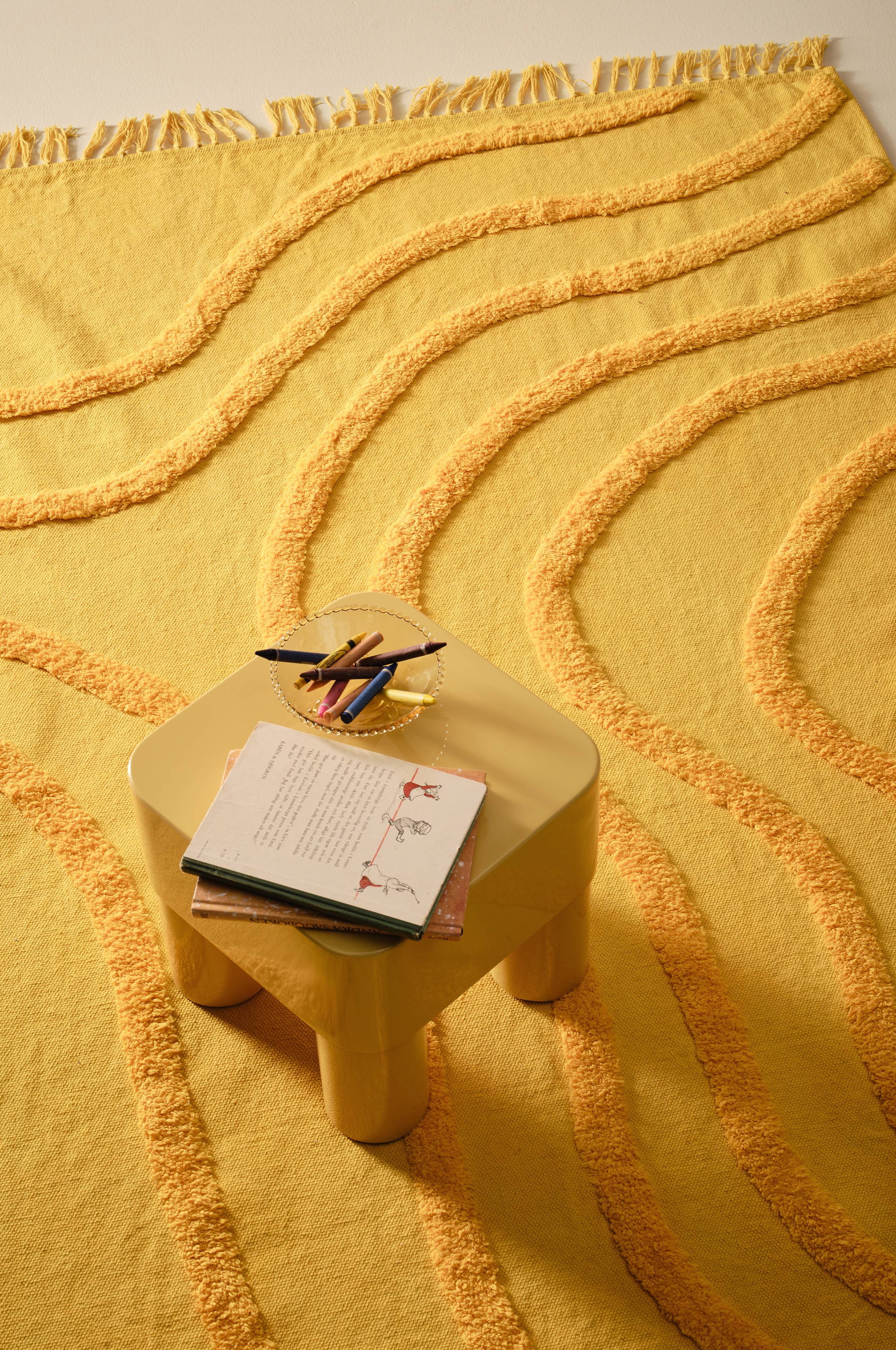 Bomullsmatta designad för barn. Bomullsmattan WAVE har en slätvävd bas med ett lekfullt mönster av tuftad lugg. Den är tillverkad av ekologisk bomull och ger en mysig och elegant touch till alla rum. Perfekt för små barn att leka och koppla av på.