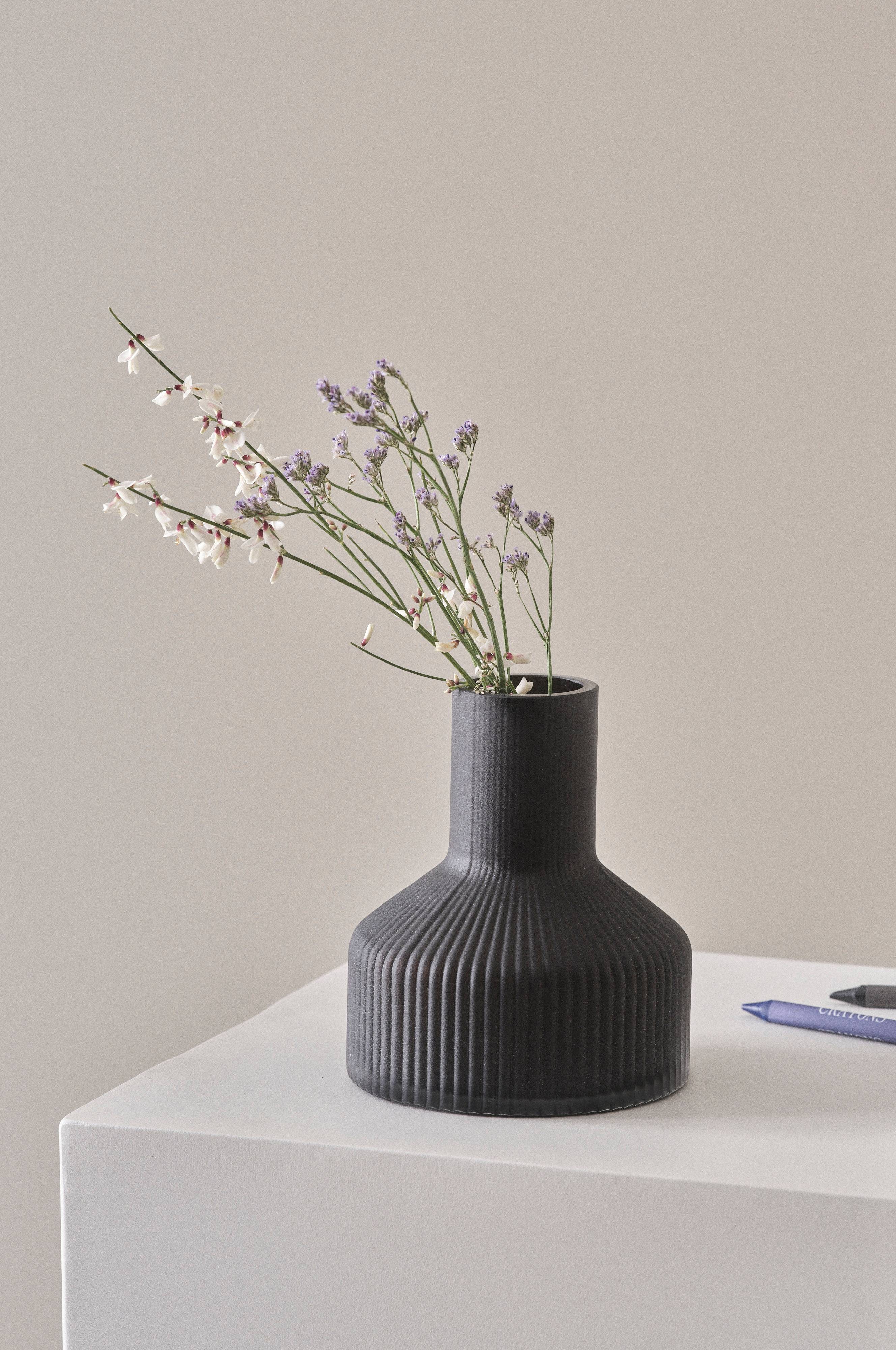 Smalrandig vas av glas som sandblästrats för matt, läcker effekt. Vasen är stilren och står stabilt på en bredare bas.
