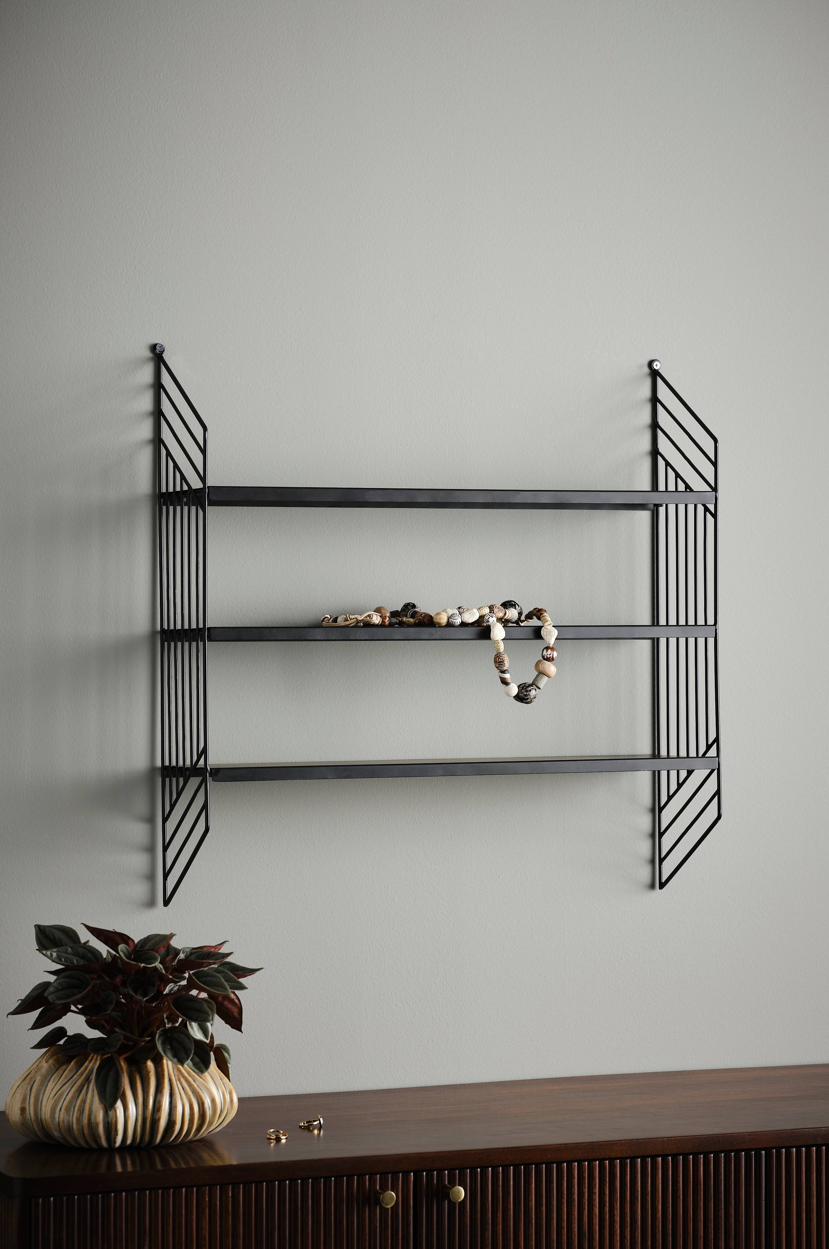 Vägghylla av pulverlackad metall med retrokänsla. Hål för upphängning. Maxbelastning 15 kg.