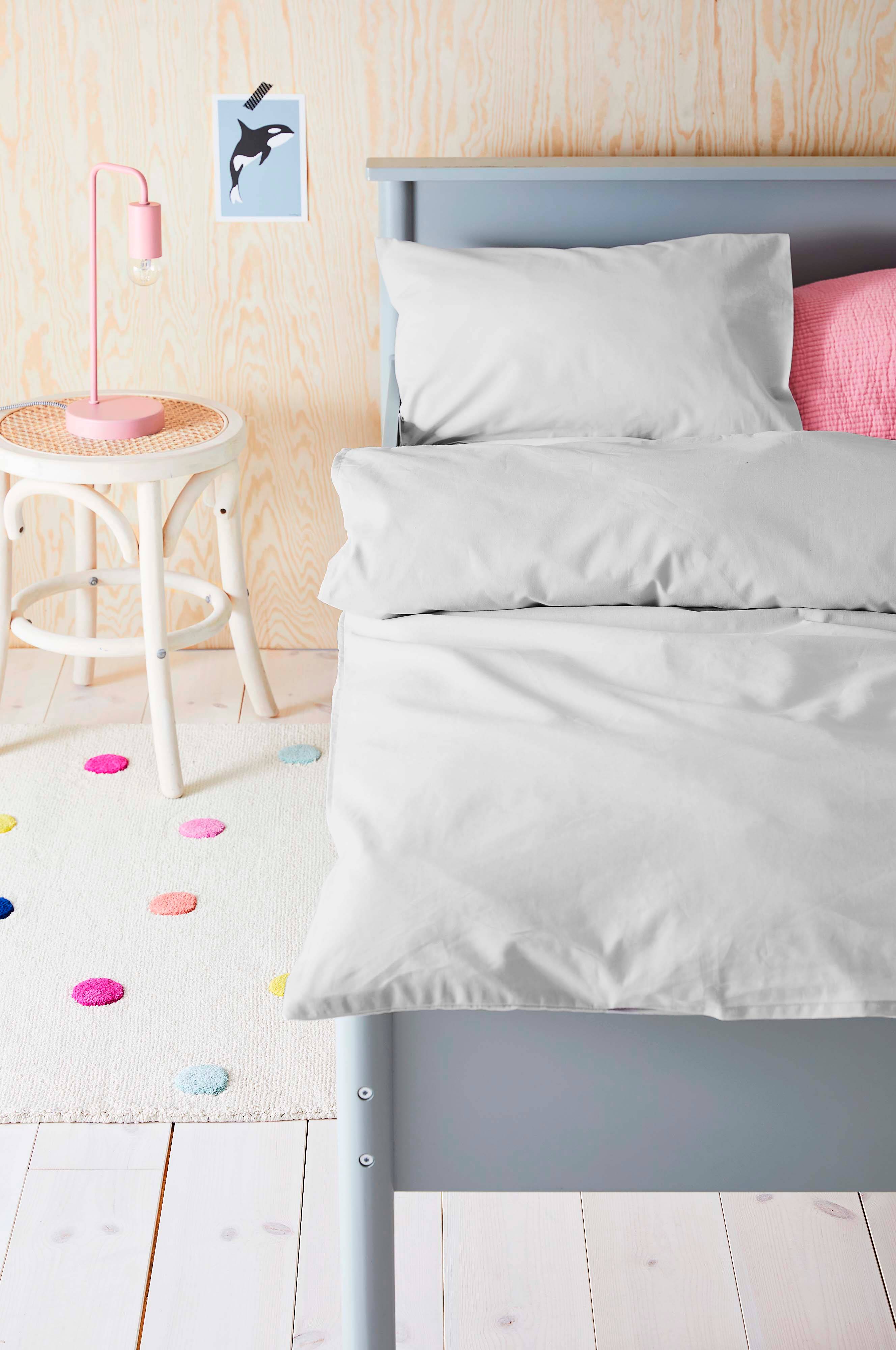 Påslakanset i 2 delar i enfärgad ekologisk bomull. Bädda enfärgat även till den minsta i familjen. Nu kan du matcha vuxen- och juniorbädden med mjuk ekologisk bomull. Trådtäthet på 144 tc. (Trådtätheten talar om antalet trådar, thread counts, per kvadrattum i ett tyg. Ju högre trådtäthet desto högre kvalité).