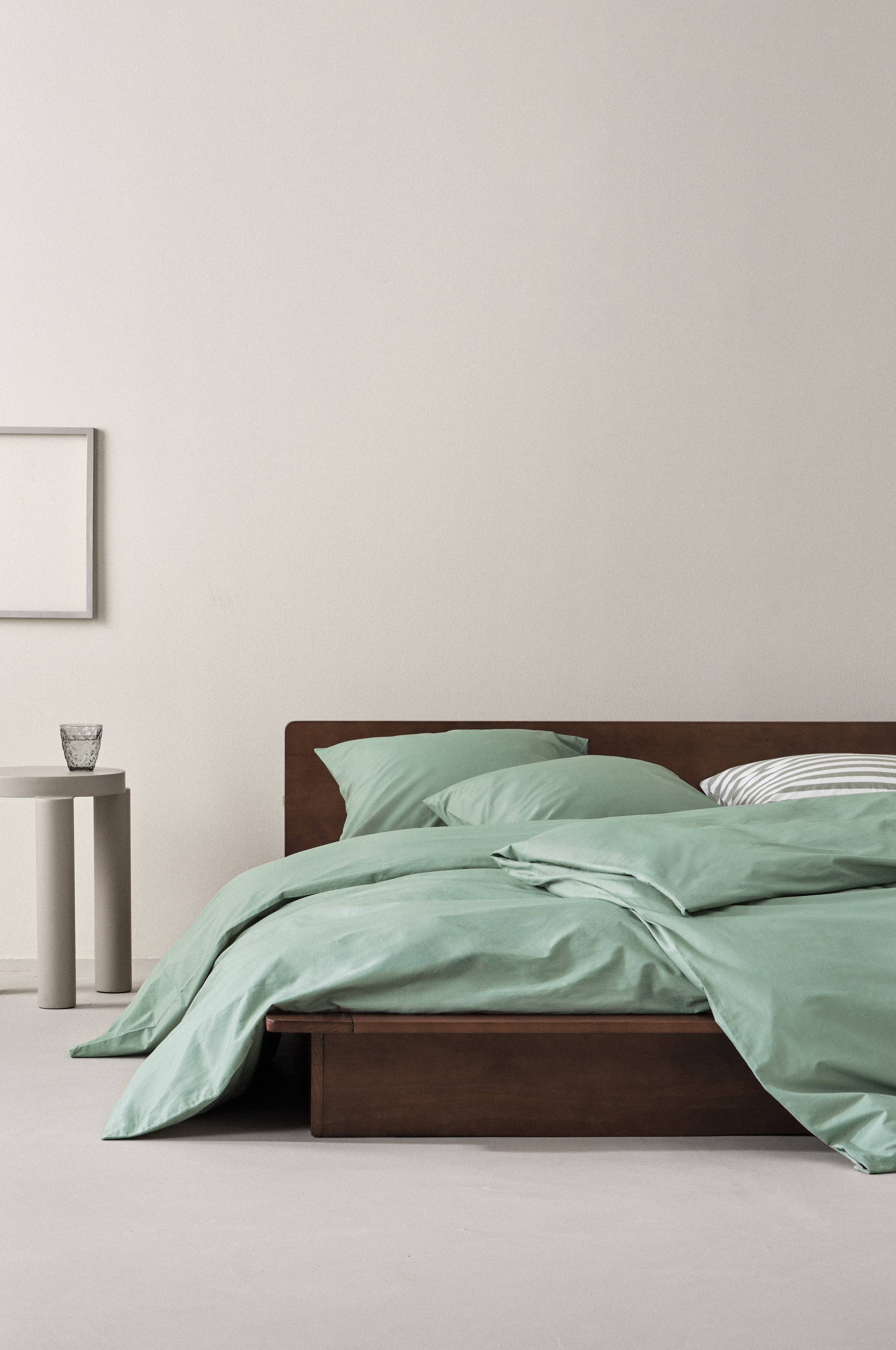 Enfärgat påslakanset i två delar, ett påslakan och ett örngott i underbar percale av ekologisk bomull. Percale är ett extra mjukt och behagligt tyg som vävts med tunna, fina bomullstrådar. Öppning i övre hörnen på påslakanet, som underlättar att trä påslakanet över täcket. Trådtäthet på 200 tc. (Trådtätheten talar om antalet trådar, thread counts, per kvadrattum i ett tyg. Ju högre trådtäthet desto högre kvalité.)