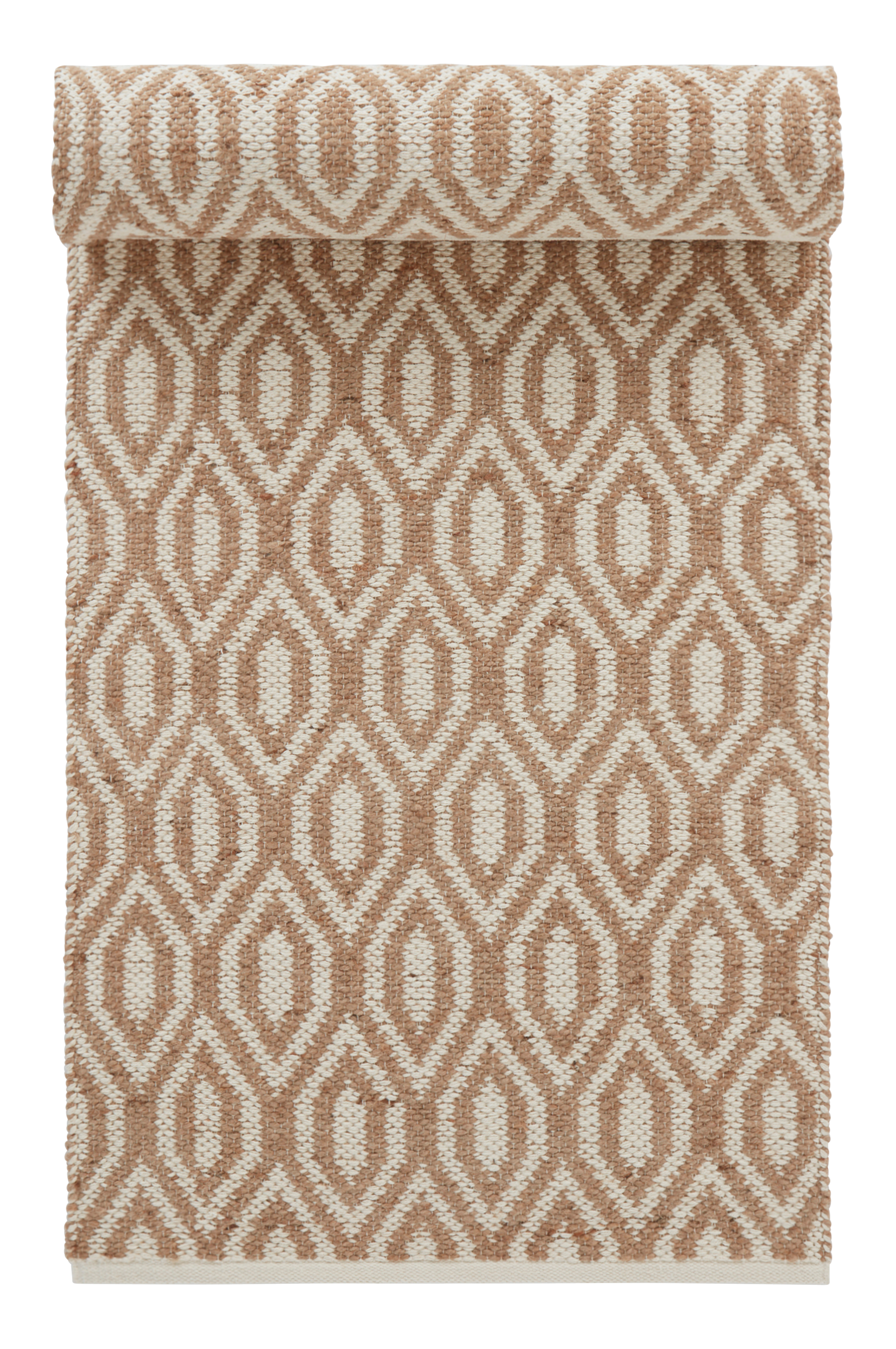 Handvävd matta av härlig mix av jute och bomull. Mattan har ett dekorativt, vävt mönster och stadig kant längs kortsidorna. Jute är ett rustikt naturmaterial. En handgjord matta är ett fint hantverk och varje matta är unik. Tjocklek 0,5 cm. 1900 g/m².