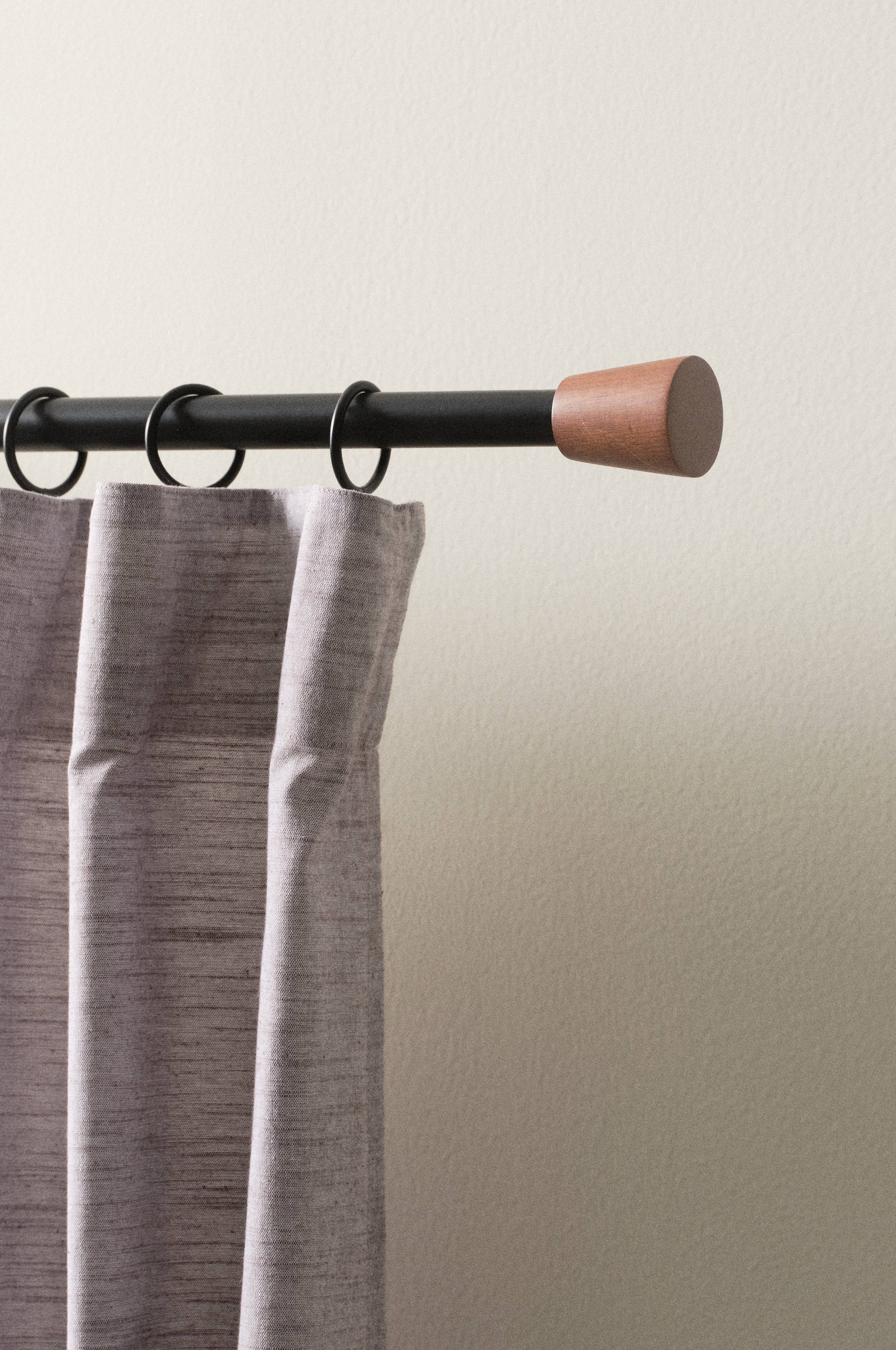 Gardinstång av järn med elegant formade ändknoppar av FSC-certifierat trä. Gardinstångens längd är justerbar. Ändknopparna skruvas på. Fem väggfästen, skruvar och plugg ingår. Observera att det alltid är underlaget som bestämmer vilken typ av infästning som är bäst lämpad för montering.